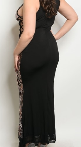 Front of this dress flaunts sequins, embroidery and sheer mesh in rose gold and black. The back is slimming with all black lycra, sides have sexy Miami-style laces. 1X-2X-3X