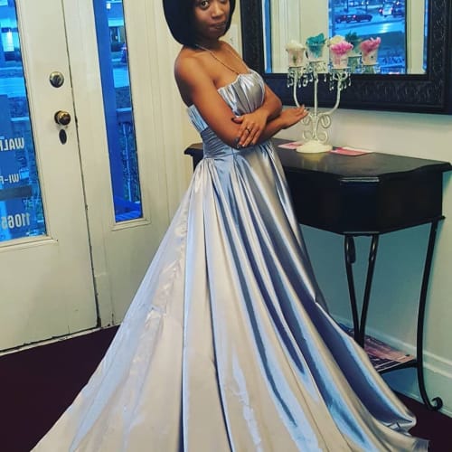 Beautiful one-of-a-kind gown located in our store. There is only one, size 4, as shown, price reduced. Fine quality as always. Color: Silver. Size: 4