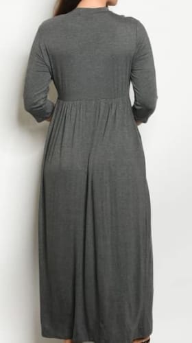 This maxi dress is a soft jersey , stretchy and fashionable. It features 3/4 sleeves, mock neck, pockets great length for wearing casual or dressy. Colors: Navy or  Olive ~ S-M-L. Grey comes in S to 3X.